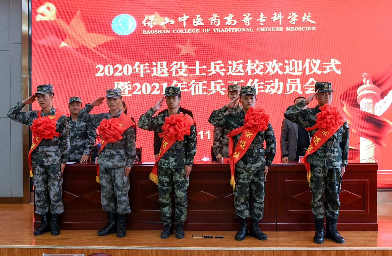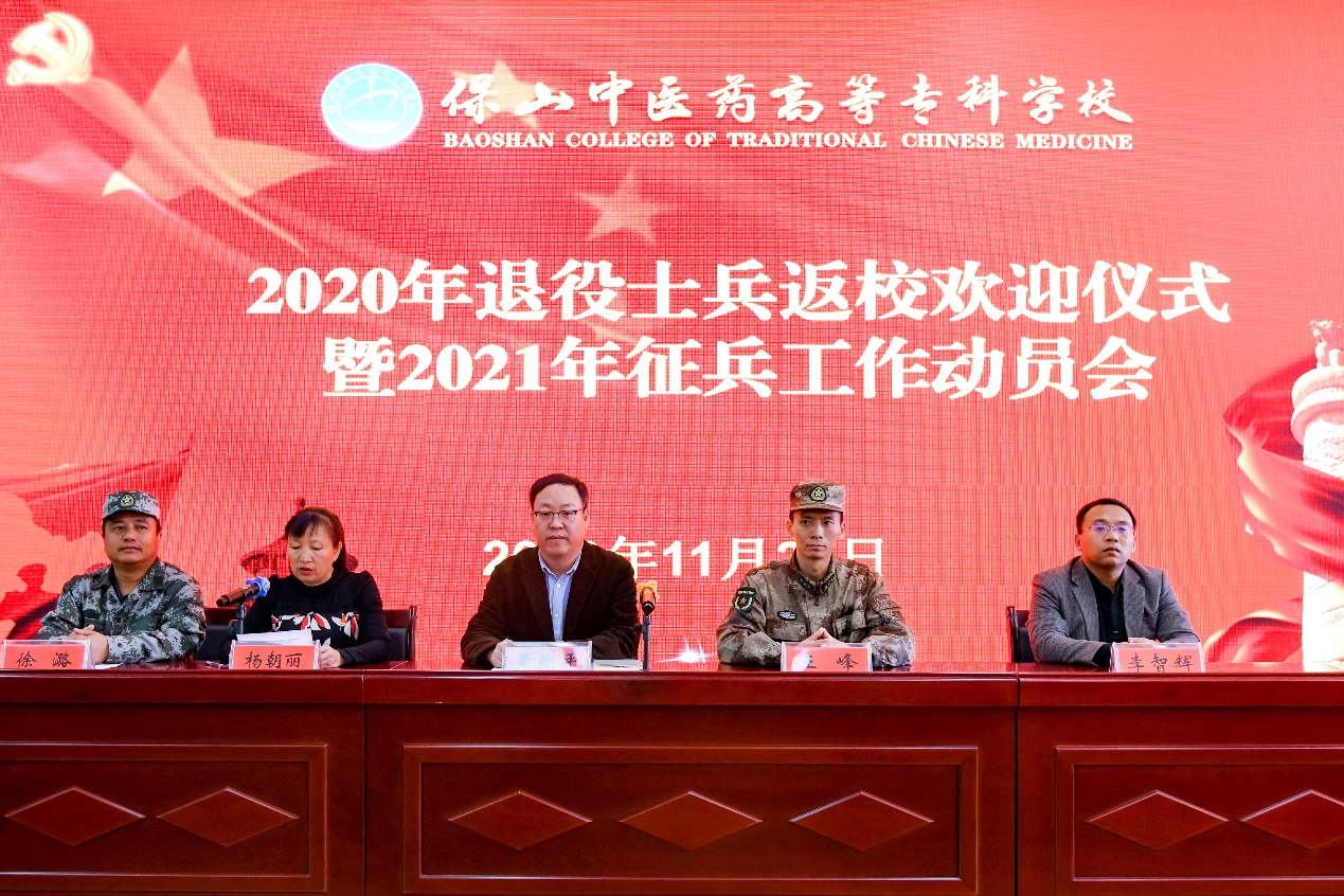 11月27日,保山中医专2020年退役士兵返校欢迎仪式暨2021年征兵工作动员会在图书馆报告厅召开。校党委书记黄鹤平,党委副书记杨朝丽,校党委委员、副校长李智辉,隆阳区武装部政委王峰等领导出席会议。