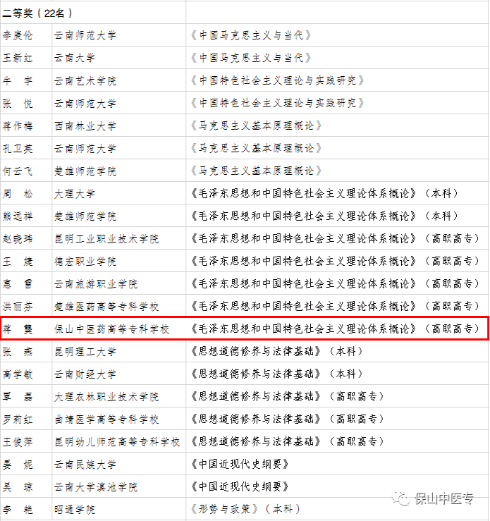 近日,省委教育工委公布了全省高校思想政治理论课现场教学展示活动获奖名单,保山中医专思政教师蒋龑在活动中荣获二等奖。