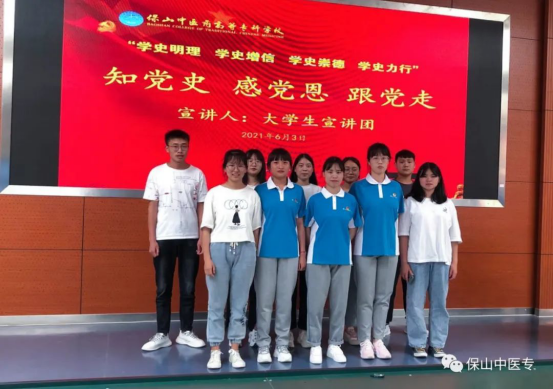 为推动全校党史学习教育持续开展,教育引导广大青年学子“学党史、强信念、跟党走”。5月20日以来,保山中医专大学生党史学习教育理论宣讲团正式面向全校学生宣讲。