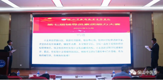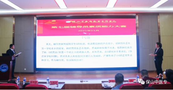 为全面贯彻落实全国全省高校思想政治工作会议精神和十九届二中、三中、四中、五中、六中全会精神,进一步加强辅导员队伍专业化和职业化建设,引导广大辅导员坚定职业理想,明确岗位要求,全面提升辅导员队伍的思政育人质量,11月25日晚,保山中医专第七届辅导员素质能力大赛落下帷幕。