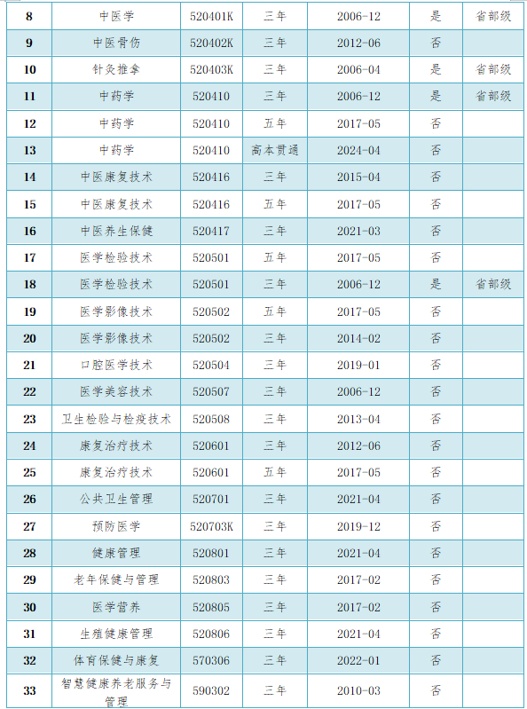 学校进一步凝练专业方向,突出专业建设重点,强化学科专业建设。按照“优化结构、突出特色、促进发展”的专业建设思路,建立专业动态调整机制。不断优化专业结构,突出办学特色,在现开设专业上,进一步适应新医科建设和大健康产业需求,在条件比较成熟的重点专业中,探索新的人才培养模式。