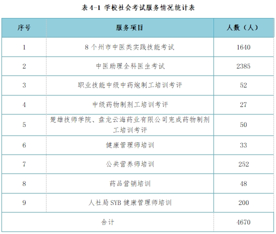 学校为国家医师资格考试实践技能考试基地;云南省第236职业技能鉴定所,鉴定工种共11个。为学校毕业生就业以及社会人员再就业能力提升提供保障,同时为学校教职工增加职业技能资格服务,推进学生“持双证”毕业和建设“双证型”教师队伍的工作进程,更好的融入到地方社会经济建设,提高公民素质,努力为学校创造良好的经济效益和社会效益。2024年为开展培训鉴定服务人次达1788人。